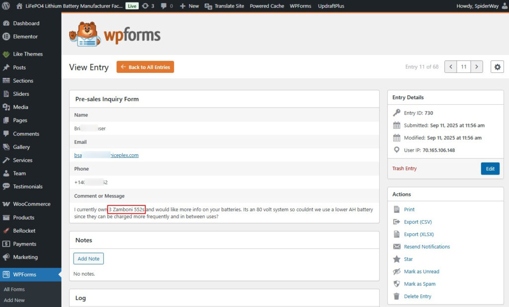 SPIDERWAY 网站 John Deere Gator TE Battery 产品页面均占据醒目位置,自然也就更大概率获取点击流量、询盘,最近每个月都有此产品的订单: