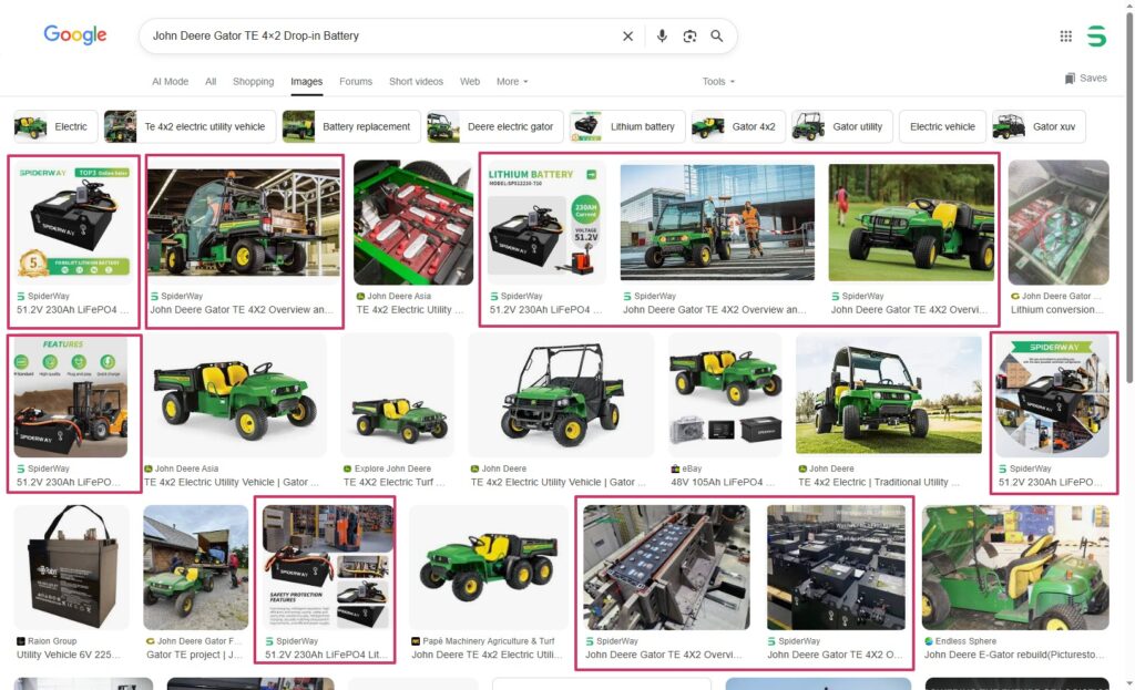 但动力锂电池最强的制造国是中国,车主查找这类产品最直接的方式无疑就是使用Google搜索车型+电池或锂电池关键词,如:John Deere Gator TE Battery