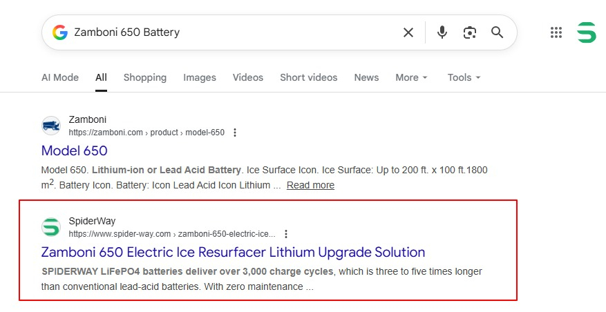 这个时候你找他们就犹如大海捞针,但有了搜索引擎,一切都变得无比的简单,他们借助搜索引擎找你,可能就是一击即中,他们知道自己的车型品牌和型号,以及什么时候需要更换电池,只要在他们需要更换电池的时候搜索(Zamboni battery)找得到你就够了,而这就建立在你提前做好了相关词汇的SEO基础之上:
