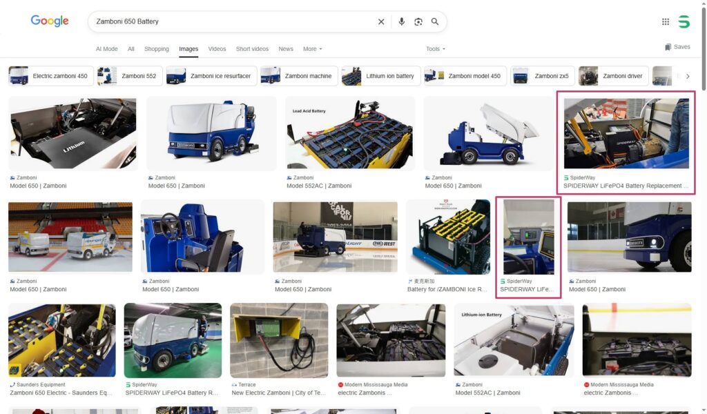 无论这个用户在世界任何地方,在任何需要电池的时候,只要他使用Google搜索他的车型品牌型号+Battery(电池)词组,包括以该词组为核心拓展的很多关联词组,Ice Resurfacer Lithium Battery (冰面修整机锂电池)都能找到我的客户: